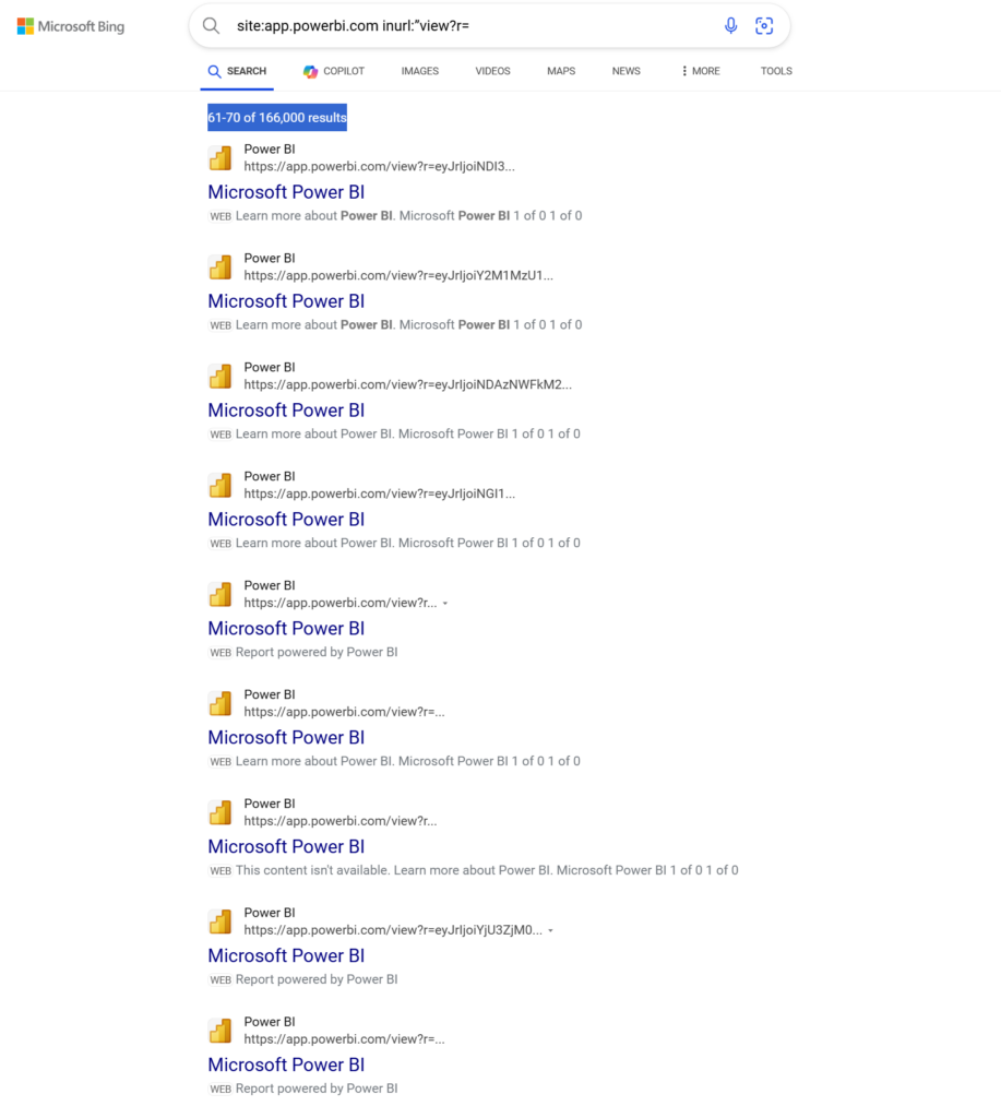 Variations of this search string, such as : site:”https://app.powerbi.com/view?r=” + sales, can yield more focused results. Some of our queries based on this specific search string generated more than 50,000 results.